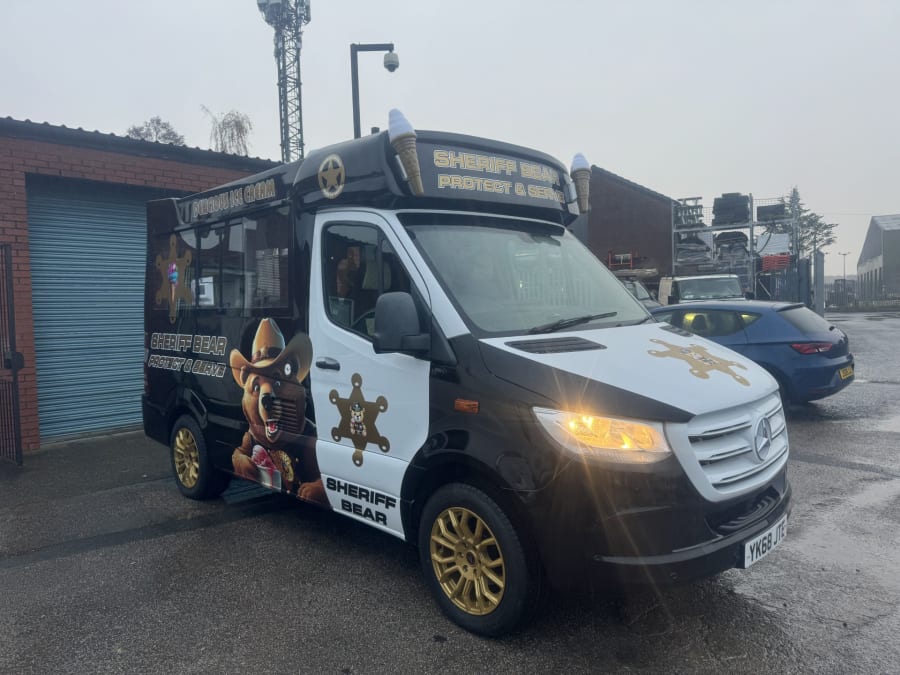 Sheriff Bear ice cream van hire brings bright, family-friendly ice cream service to your event. Themed exterior and costumed staff create memorable moments for kids and parents. Short queues, fast service and big smiles make this a top choice for birthdays, school fairs and community gatherings.